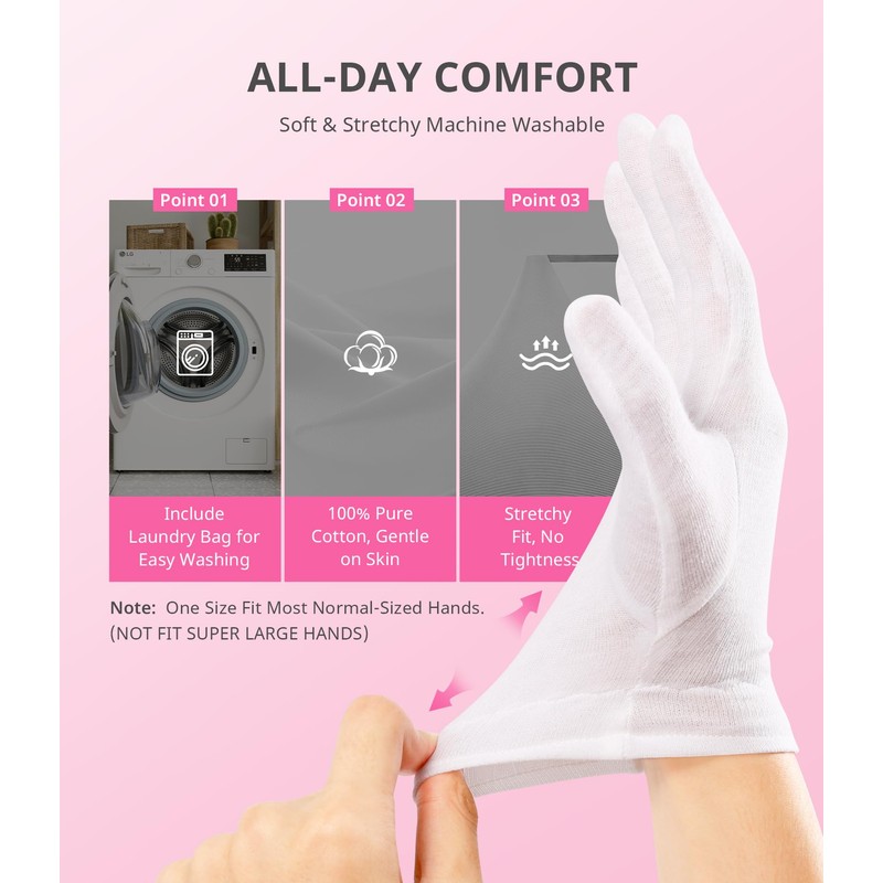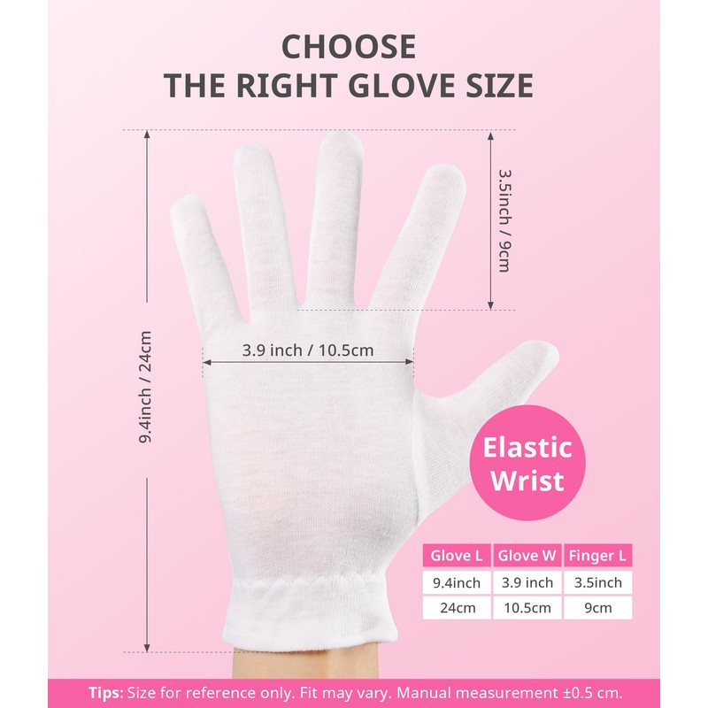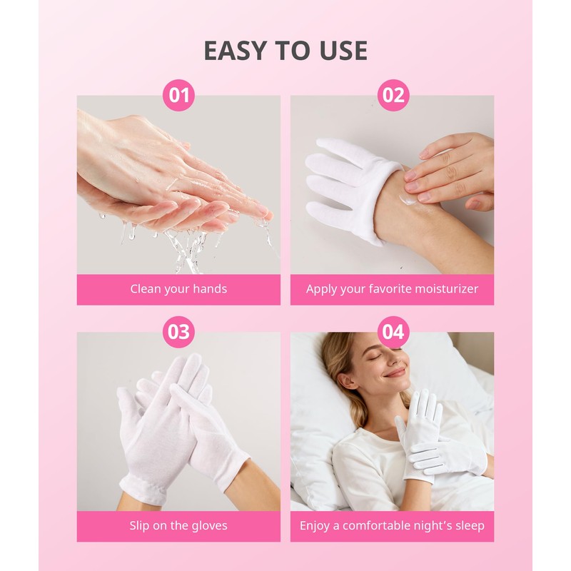- Overnight Moisturizing Care: Apply lotion or hand cream, then wear the gloves overnight for deep hydration. Breathable cotton absorb in moisture without feeling hot or sticky.