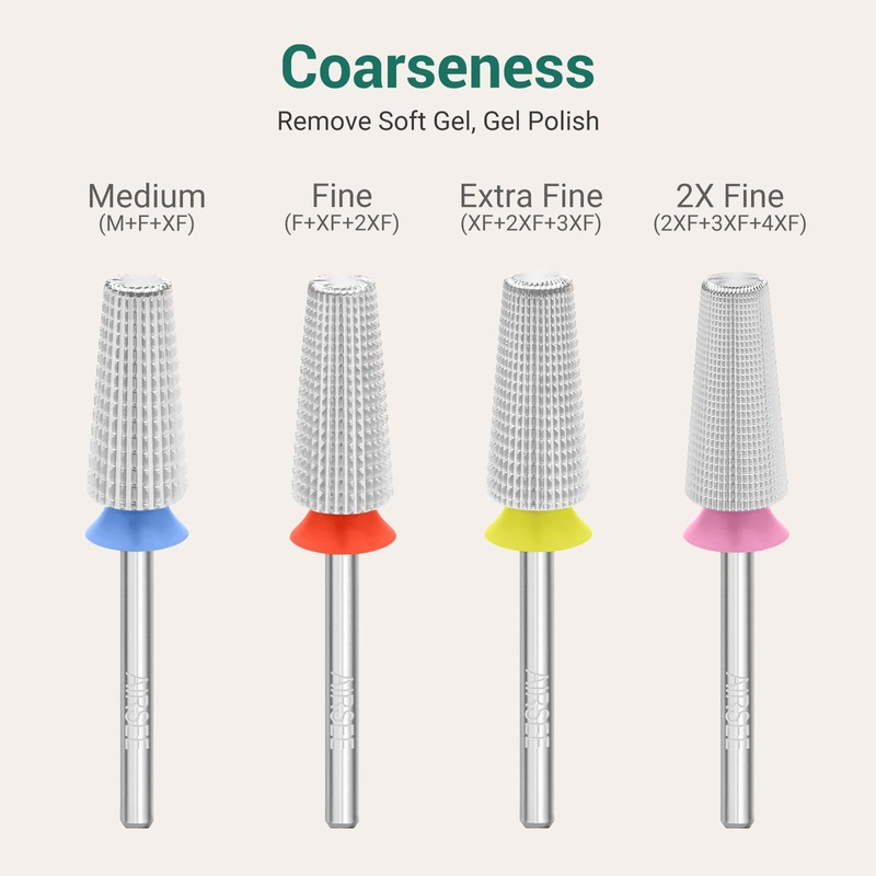 • Shape: 5 in 1 Mix 3 Coarseness: The drill bit is flat at the top but with the round edge which can easy and quick smooth any hard-to-reach nail edge area, and can also be used to remove dead skin without cutting the skin around. The tapered body includes three coarseness levels: 4XF (upper), 3XF (middle), and 2XF (lower).
