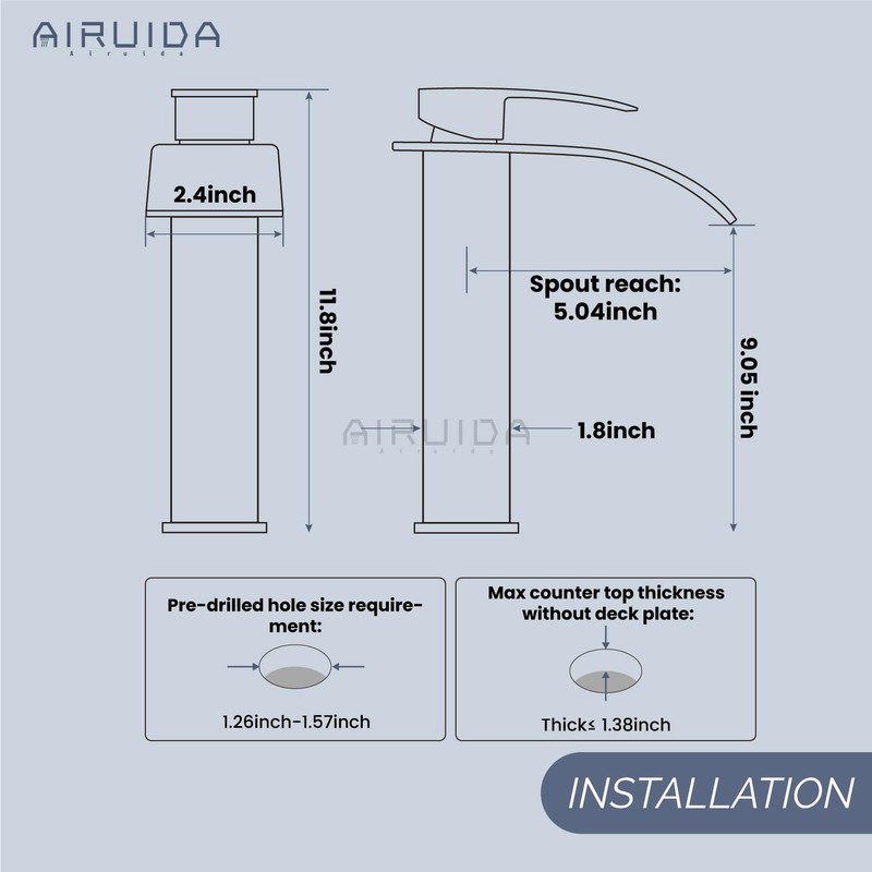- [Notice]:Tall waterfall faucets for sink mounting hole 1.25 inch (3.2cm) to 1.57 inch(4cm). The packaging includes standard US 3/8” hoses, 3/8” and 1/2'' water line adapters.