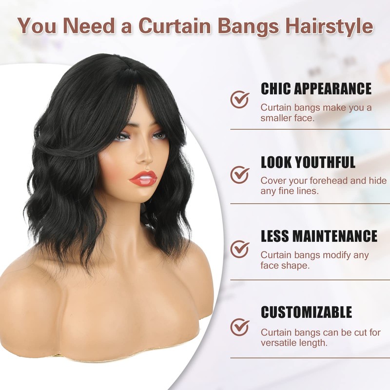 - 【Curtain Bangs Short Curly Wavy Bob Wig Advantage】: The beauty of curtain bangs is that they can work on anyone and everyone. Almost any face shape can pull off curtain bangs, it's to adapt the look to compliment your face shape and hair texture.