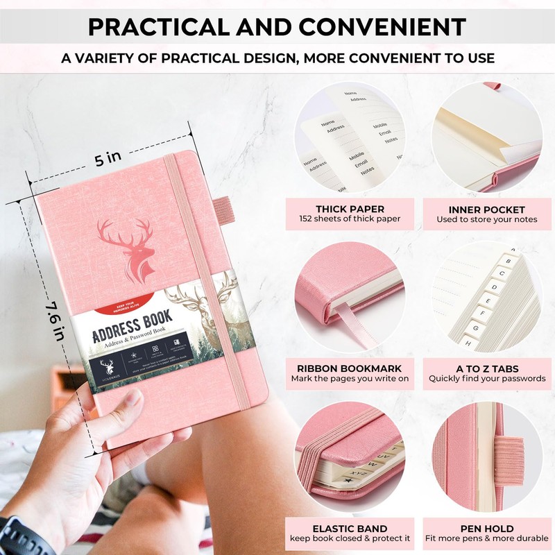 - 【Elegant Design】 Measuring 5 x 7.6 inches, this address notebook is crafted from high-quality, thick no-bleed 100gsm paper, ensuring that ink doesn’t bleed through during use. The book comes equipped with an elastic closure band, a bookmark ribbon, and a back pocket for storing loose items, adding both functionality and style.
