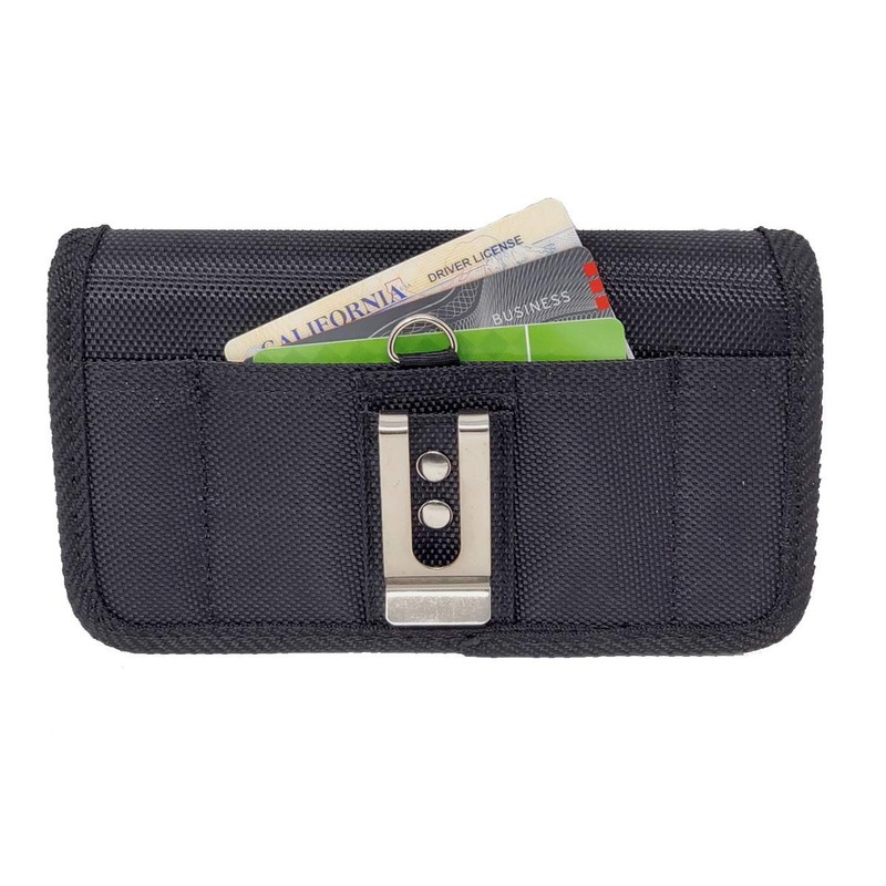 - Pouch case has a fixed metal belt clip for durability . Belt loop to hold the carrying pouch in horizontal position on their belt. Another option is to use the built-in dual riveted metal clip to quickly attach and detach the pouch from a belt or pocket.