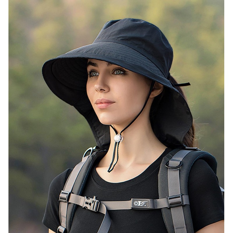 - (With ponytail hole and chin strap) The back has a hole to release tied hair, making it recommended for women with ponytails. This hat is an integrated wide brim that covers the back of the neck well, but it can be folded with a hook and loop for an adjustable UV protection when you don't want to ruin your hair. The women's hat with chin strap allows you to adjust the fit around your head and prevent it from being blown away by the wind