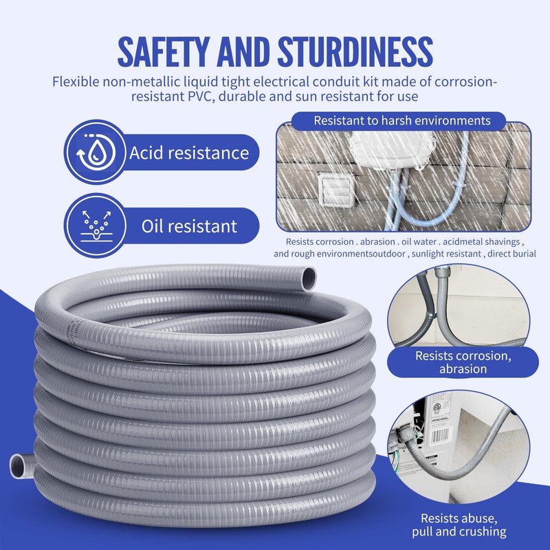 • 【Safety and Sturdiness】-AISIMEE’flex conduit 1 Resists corrosion, abrasion, oil, water, acid, metal shavings, and rough environments; resists abuse, pull and crushing; outdoor, sunlight resistant, direct burial,50% lighter than metallic conduits