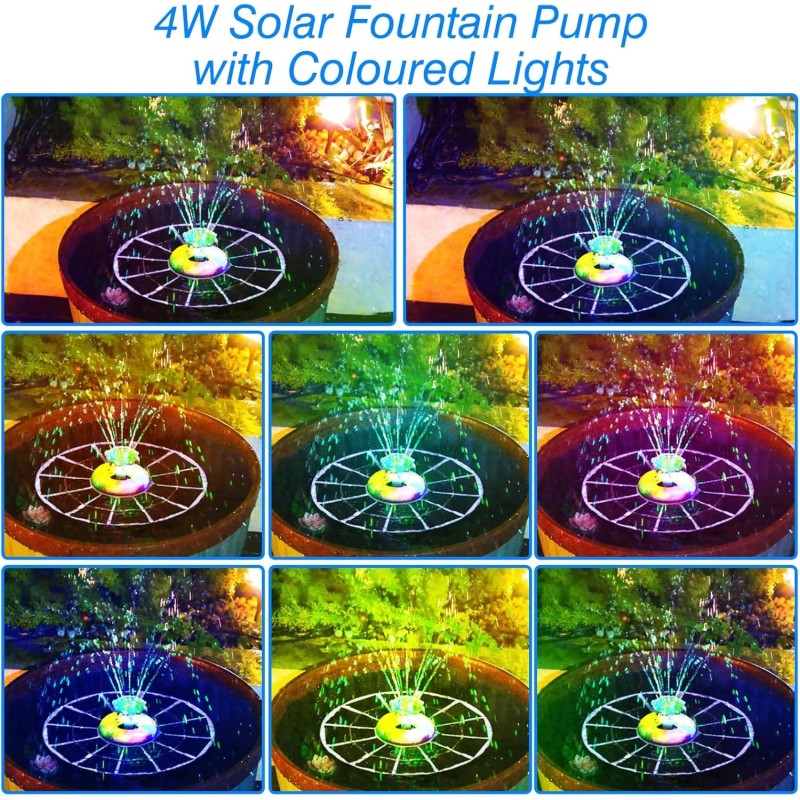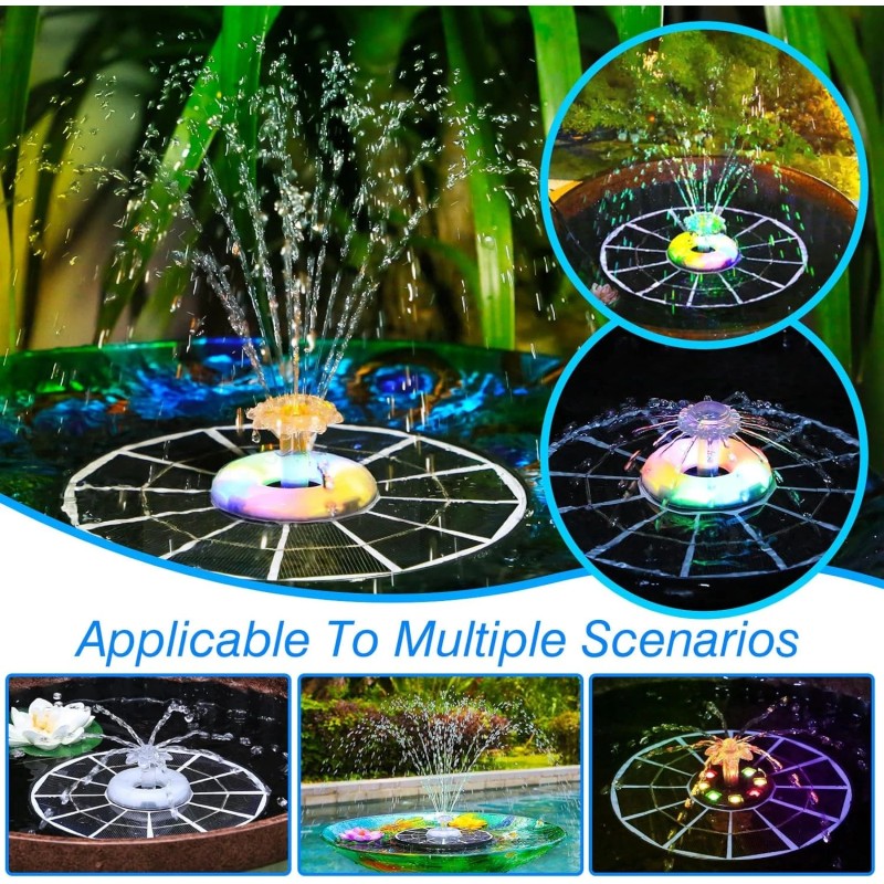 4W solar bird bath fountains is equipped with 8 LEDs. Even as night falls, solar water fountain pump continues to dazzle with beautiful illumination. Beautiful fountain light switches colors randomly, presenting a colorful and unique water scene.