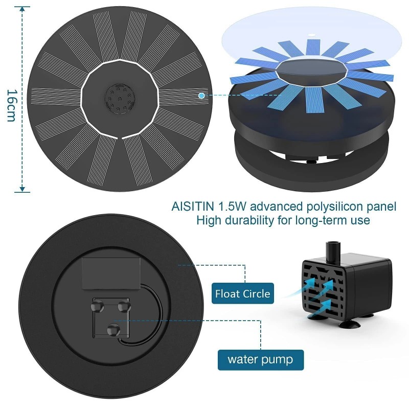 AISITIN Solar Power Bird Bath Fountain Pump Upgrade 1.5W Solar Fountain with 6 Nozzle AA