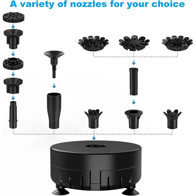 Our solar water fountain contains three sets of nozzles, Rotating Nozzle Set, Fixed Nozzle Set and Mushroom Splash Nozzle Set. You can combine two rotating spray styles, four double-layer spray styles, three normal spray styles and two mushroom spray styles. These spray styles are perfect for birdbaths, gardens, ponds and fish tanks. Please refer to the manual for the combination method.