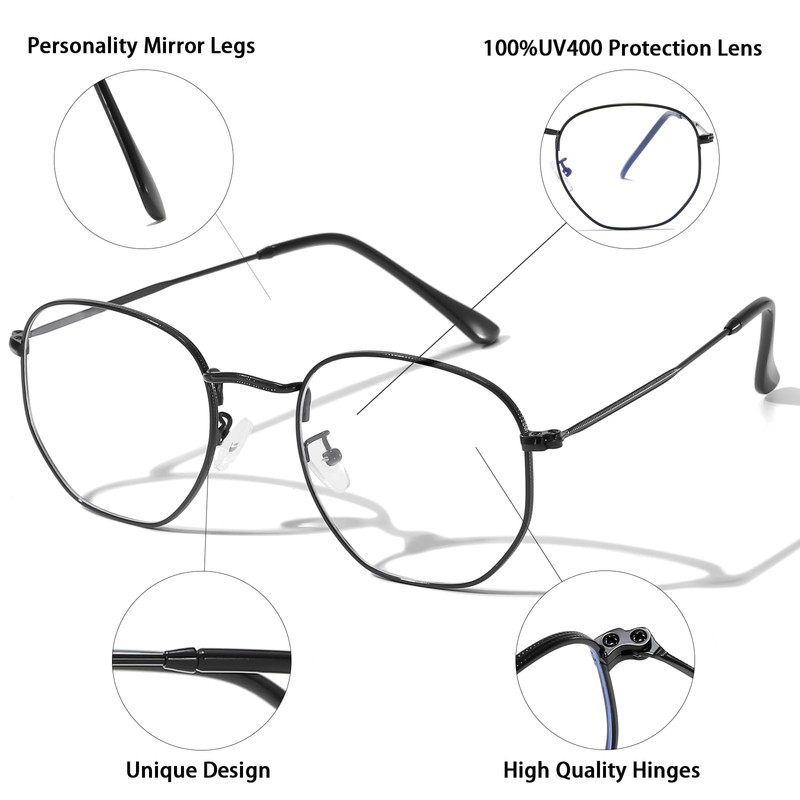 • Ergonomic Hexagonal Design & Lightweight Metal Frame:Unique 6-sided shape combines modern aesthetics with durability. Ultra-lightweight metal ensures all-day comfort without pressure on nose or ears