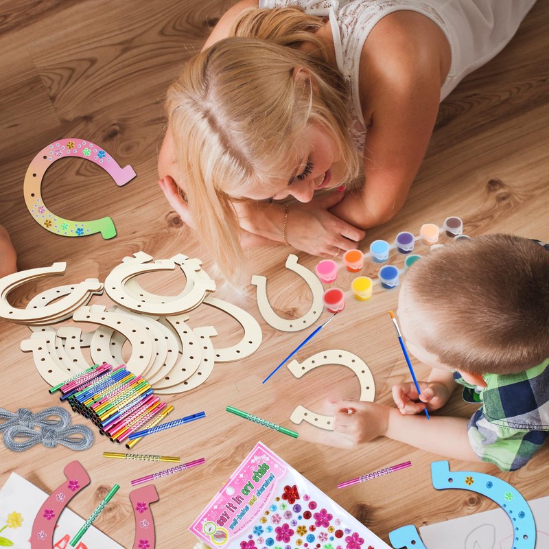 - Wind play craft set for children: wind chime horseshoe contains 16 wooden horseshoes, 48 wind chime tubes, 16 bands, 16 metres wind chime wire, 12 colours, 2 brushes and 1 diamond sticker.