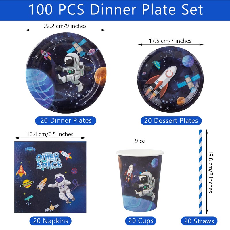 • Space party tableware set: you will receive: 20 plates 7 inches, 20 plates 9 inches, 20 napkins, 20 cups, 20 straws, a total of 100 pieces for 20 guests. Note: Our tableware is not suitable for microwave.