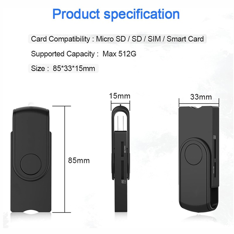 - Wide card compatibility: 5V, 3V and 1.8V smart cards, memory cards - SD card / Micro SD card / Micro TF card / MMC / SIM card.