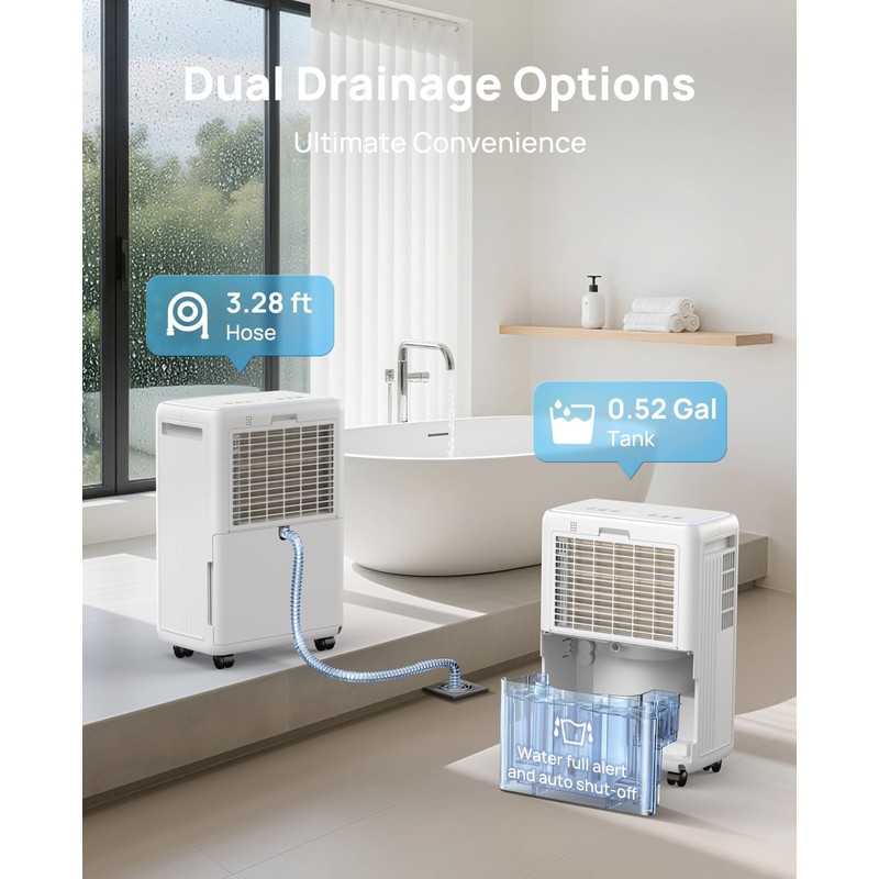 • Two Drainage Options & Auto Shut Off - Skip the constant tank emptying! Our dehumidifiers makes life easier with a 0.52-gallon tank that automatically stops when full. Plus, use the included 3.28 ft drain hose for continuous operation. Enjoy hassle-free moisture control without interruptions – perfect for busy homes