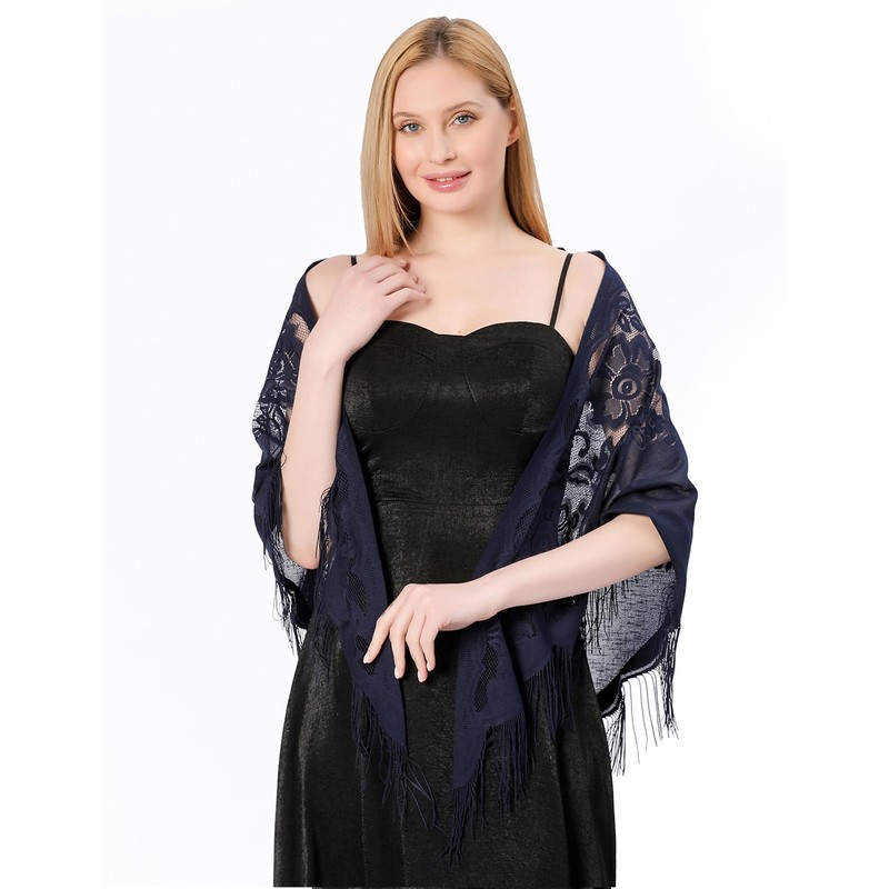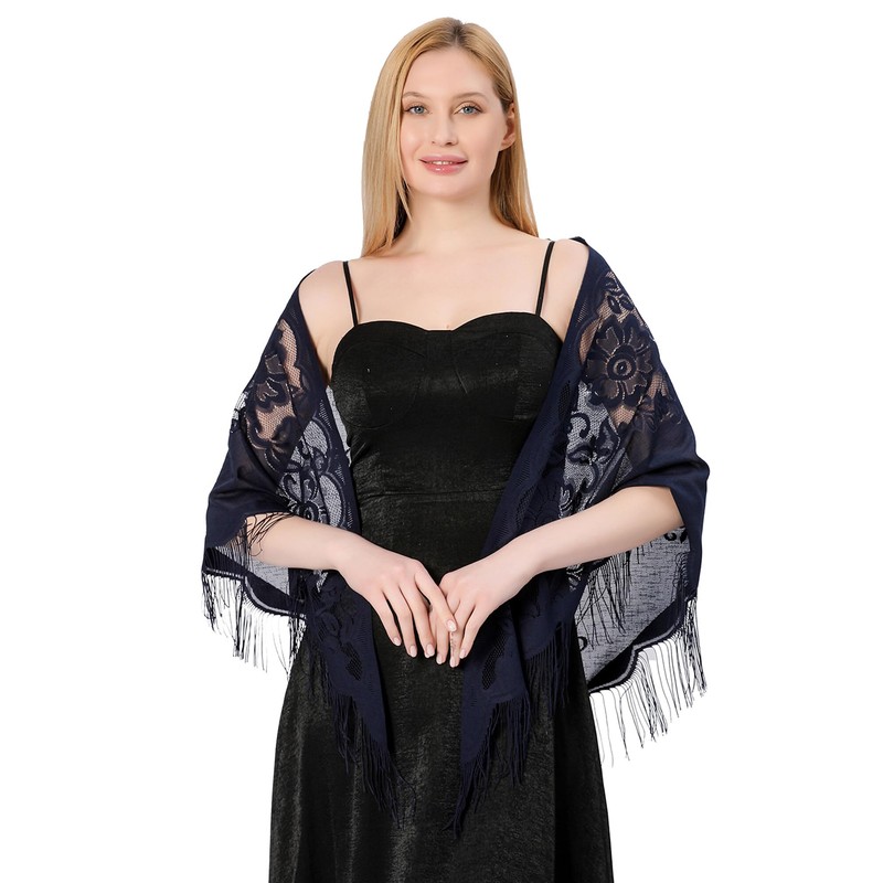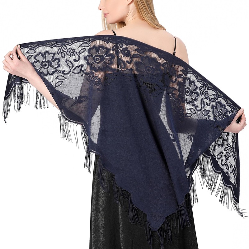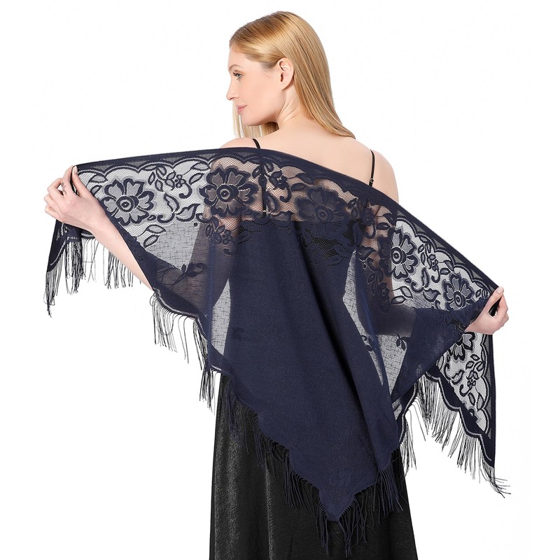 Aivtalk Women Triangle Floral Lace Shawls and Wraps with Tassels Soft Mesh Sheer Scarf Shawl for Wedding Evening Party Dark Blue