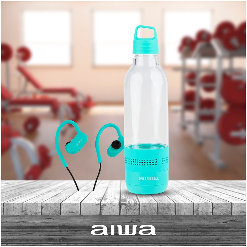 AIWA Water Bottle with Speaker and Earphone Bundle - 400ml Water Bottle with 4 Hour Playtime and Wireless Sports Earphones with Integrated Mic, 10 Hours Playtime for Workout, Camping and Hiking