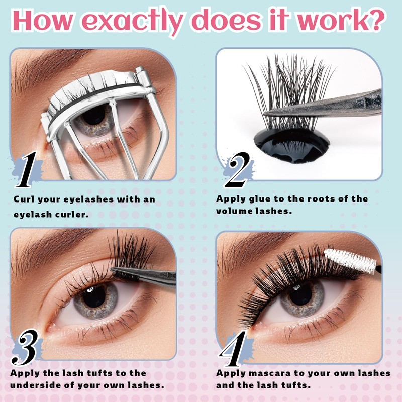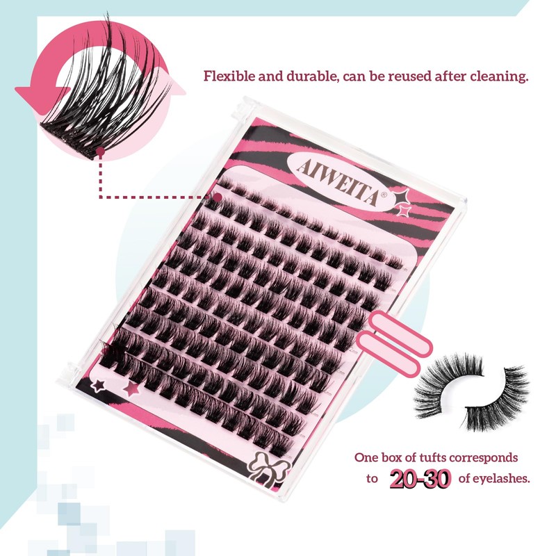 - Save Money & Time: DIY Lash Extensions at home, AIWEITA individual lashes clusters are easy to apply by yourself. The false eyelashes of this cluster lashes use thin band to make them flatter and more natural to blend with your own lashes more fully. You can creating more style possibilities - cat eye effect, natural, fluffy, and etc. Wispy eyelash clusters allowing you to customize according to your needs. D Curl cluster eyelashes help you easily create a charming big eye makeup look.