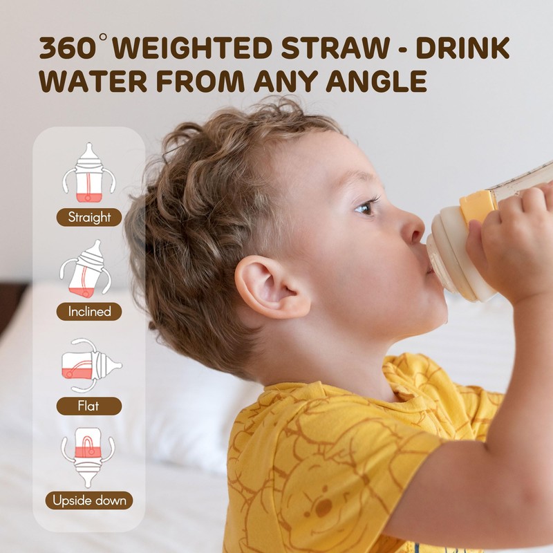 - [360° Gravity Ball Straw] Equipped with a gravity ball straw, the bottle allows for 360-degree drinking from any angle. No matter how the bottle is tilted, your baby will easily drink water. The straw nipple also helps transition to a straw cup, extending the bottle’s usability as your baby grows