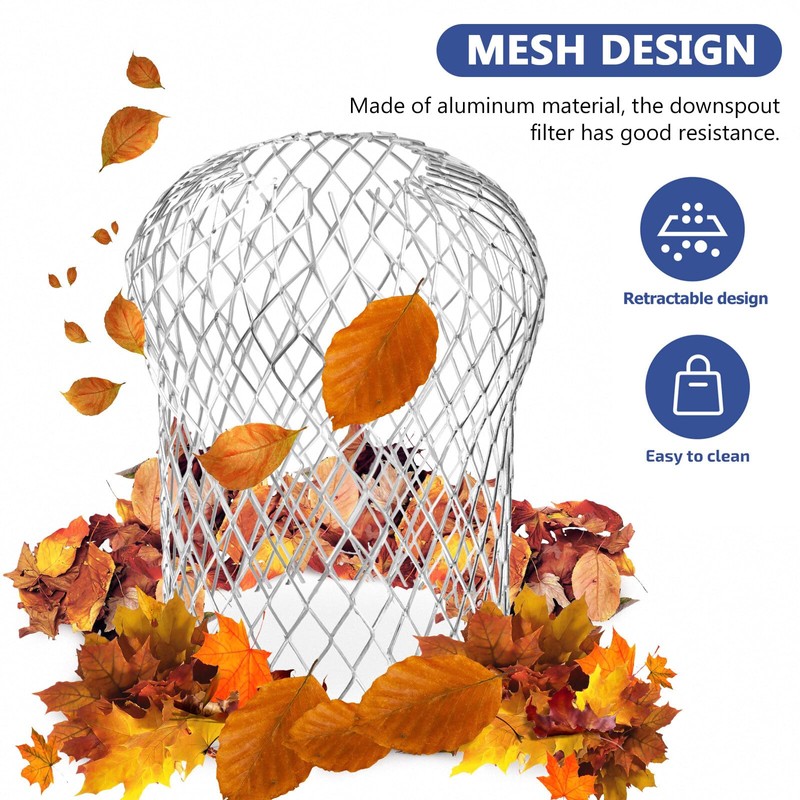 "Have you ever been disturbed by uninvited guests in your drain pipes? No more worries! Gutter drain filter covers create an unparalleled drainage experience for you. Why choose us? ① Perfect fit: the gutter drain filter cover adopts a round head design, which not only easily adapts to different types of drain pipes, but is also simple and easy to install. Tailored fit, there is no room for fish to slip through the net to hide. ② HIGH EFFICIENCY FILTRATION Compared with competitor products, we use a unique filter design that is as fine as silk and filters layer by layer to ensure smooth drainage while catching all fallen leaves and dirt, allowing you to say goodbye to the trouble of cleaning. ③Durable Material We pay attention to product quality and use durable materials to ensure it does not deform. or fade after long-term use. One-time purchase, long-term benefits, peace of mind and effort.Specification:Material: aluminum metalColor: silverProduct size:15*8cmPackage Includes:Filter Cover x 5 inch