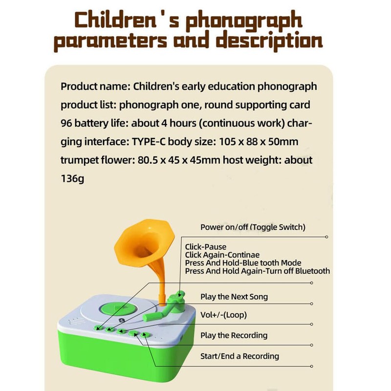 - Simple : The children's phonograph features a simple for inserting cards and adjusting volume, making learning more enjoyable for kids