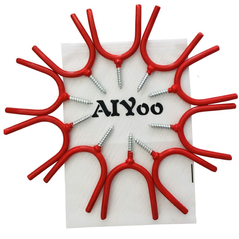 - Large Screw in Hooks:Package contains 10 screw-in wall mount hooks.Red finish.Full length is 95mm/3.8",width is 66mm/2.6",diameter is 6mm/0.24".Hangs vertically for shovels,lawn chairs, brooms,garden tools,extension cords,decorative wreaths and sports equipment or horizontally in series of 2 or 3 U-hooks and hang longer items like flag poles,bats,fishing poles or narrow tubes.