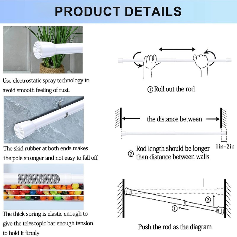 - EASY INSTALLATION:It is simple and convenient to use, it can be stretched to the length you want to use by just rotating it gently. Note that this product is a splicing type. Two rods with anti-skid pads at one end are spliced together and can be rotated for use. If you have any questions about the product, please consult our customer service team, we will serve you online 24 hours a day.