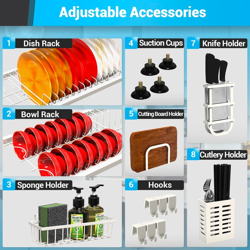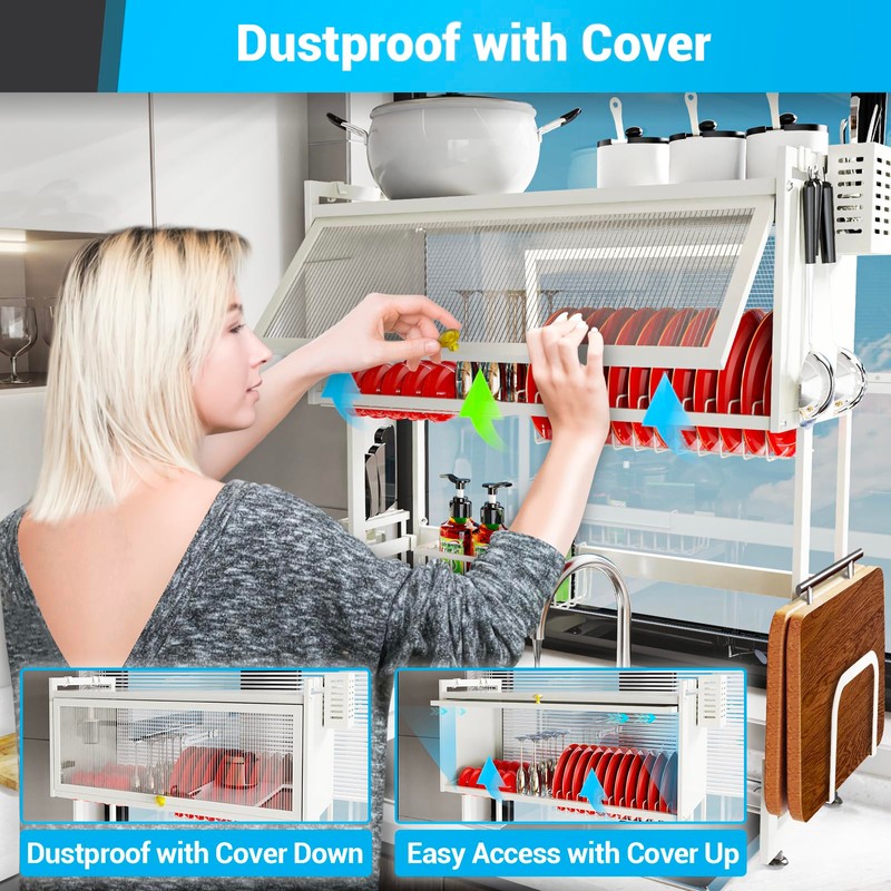 • 【Multiple Uses】This over the sink dish drying rack is a multifunctional kitchen shelf, designed for various kitchen utensils. It can hold not only any shape of plates, but also bowls, cups, knives, forks, spoons, cutting boards, and cleaning supplies. It also features a plastic cover for dust-proof storage (please remove the protective film on the cover before use).