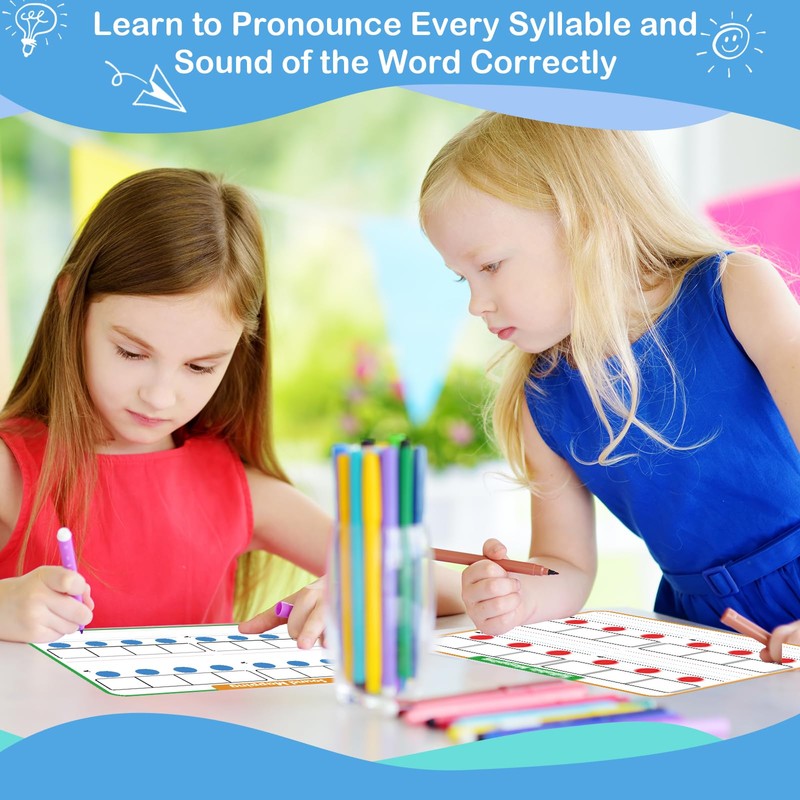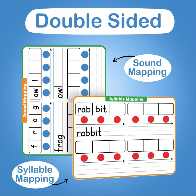- 【12 Packs Sound & Syllable Mapping Dry Erase Card】Covering sound mapping on one side and syllable mapping on the other, this flash card feature boxes for segmenting words, dots to help children pronounce one syllable or phoneme at a time. Plus arrows that allow kids to blend the sounds or syllables together to say the words. This is a great educational teaching tool to help students to learn pronounce every syllable and sound of the word correctly.