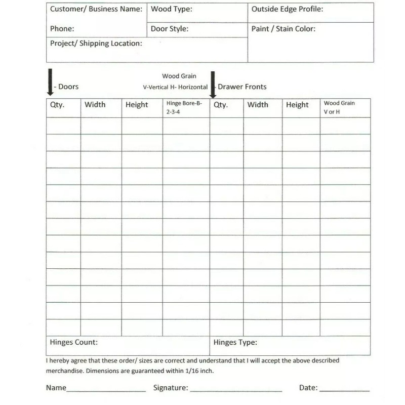 - Email quantities and sizes Width x Height for quote for your complete order prior your purchase ( vertical and horizontal grains available on doors) drawers only horizontal grain