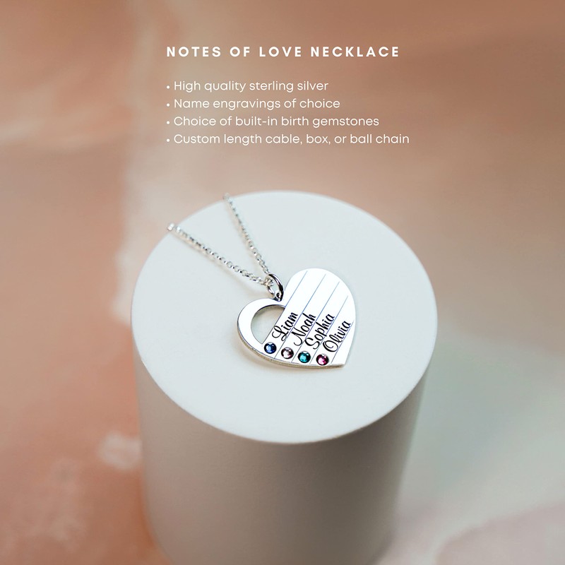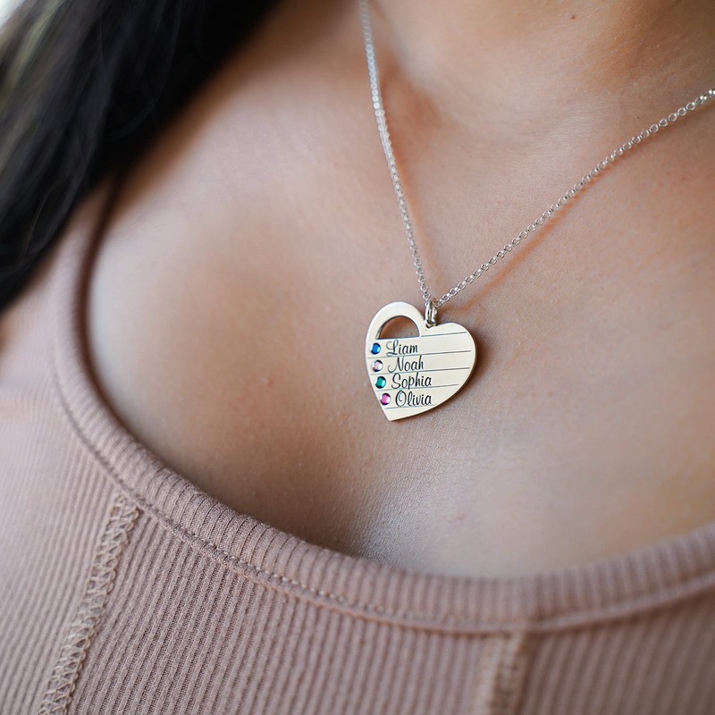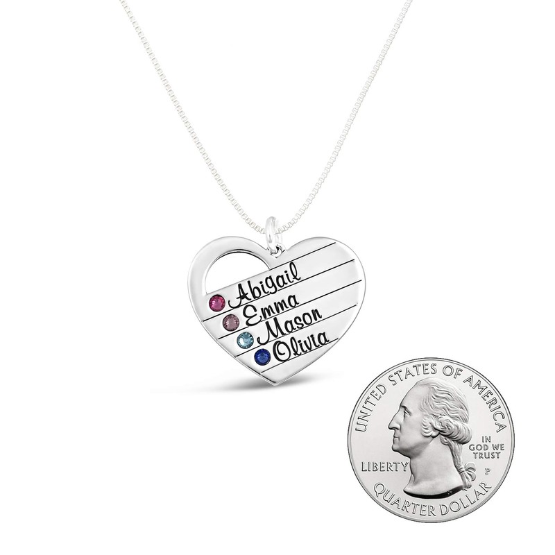 Each name on the sterling silver heart pendant is preceded by a crystal crystal birthstone. The birthstone color is chosen by you. Simply choose the month each person was born and the appropriate birthstone is matched to the name.