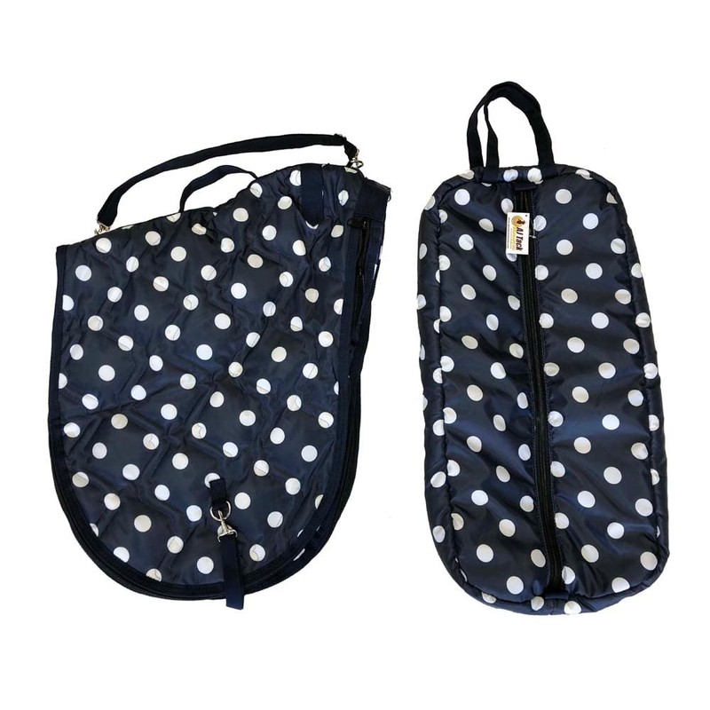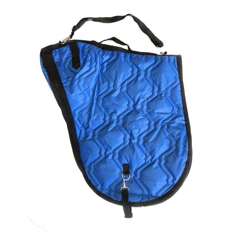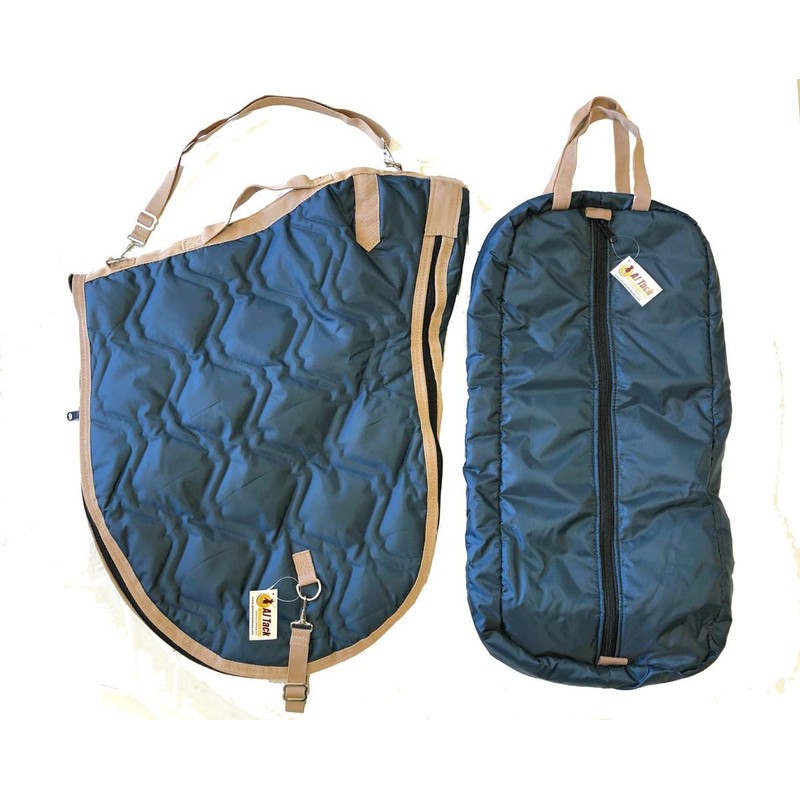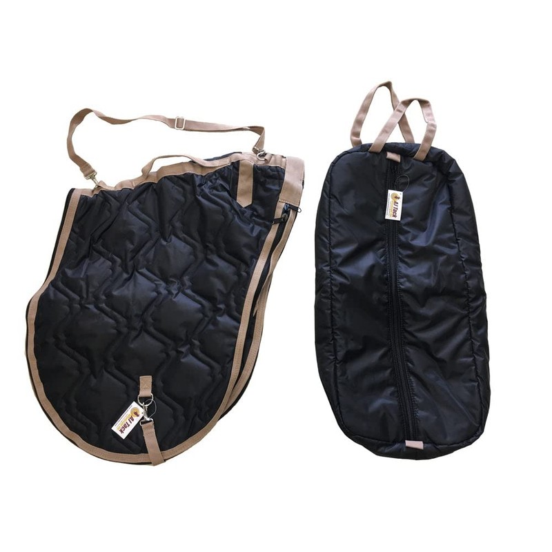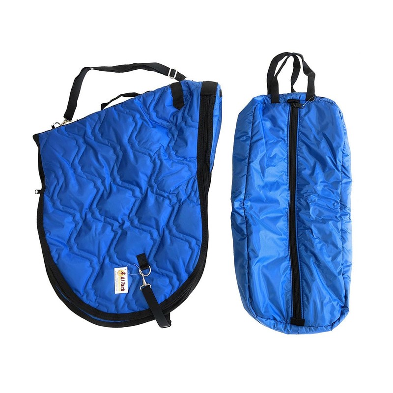 Keep your tack organized and protected with the AJ Tack English Padded Saddle and Bridle Carrier Set. This set includes a padded saddle carrier and bridle bag, both made from high-quality materials to ensure your equipment stays safe and clean during travel or storage. Features: Saddle Carrier: Water-resistant 420D poly nylon shell, poly fill insulation, and smooth nylon liner. Full-length two-way zipper, adjustable shoulder strap, and internal straps to secure saddle. Strap to keep bottom flaps together for extra protection. Size: 28" x 23" Bridle Bag: 420D nylon construction with thick insulation and black nylon liner. Double web handles, 3 Velcro straps, and heavy-duty zipper for easy access. Size: 29" x 14" x 3"