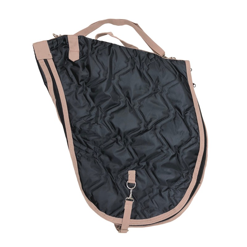 Padded English horse saddle carrying case. Made with water resistant 420 denier poly nylon shell, poly fill insulation and smooth black nylon liner. Fits most all purpose English saddles, dressage saddles. Features: