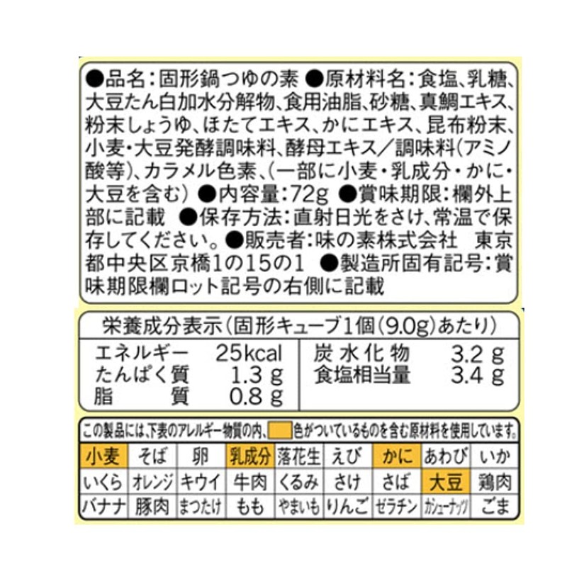 - Ingredients: Salt, lactose, soy protein hydrolyze, edible oil and fat, sugar, red bread extract, powdered soy sauce, hot water extract, clark extract, kelp powder, wheat, soy fermentation seasoning (amino acids, etc.), caramel pigment, flavoring (some parts include wheat, milk ingredients, crab, soy, pork)