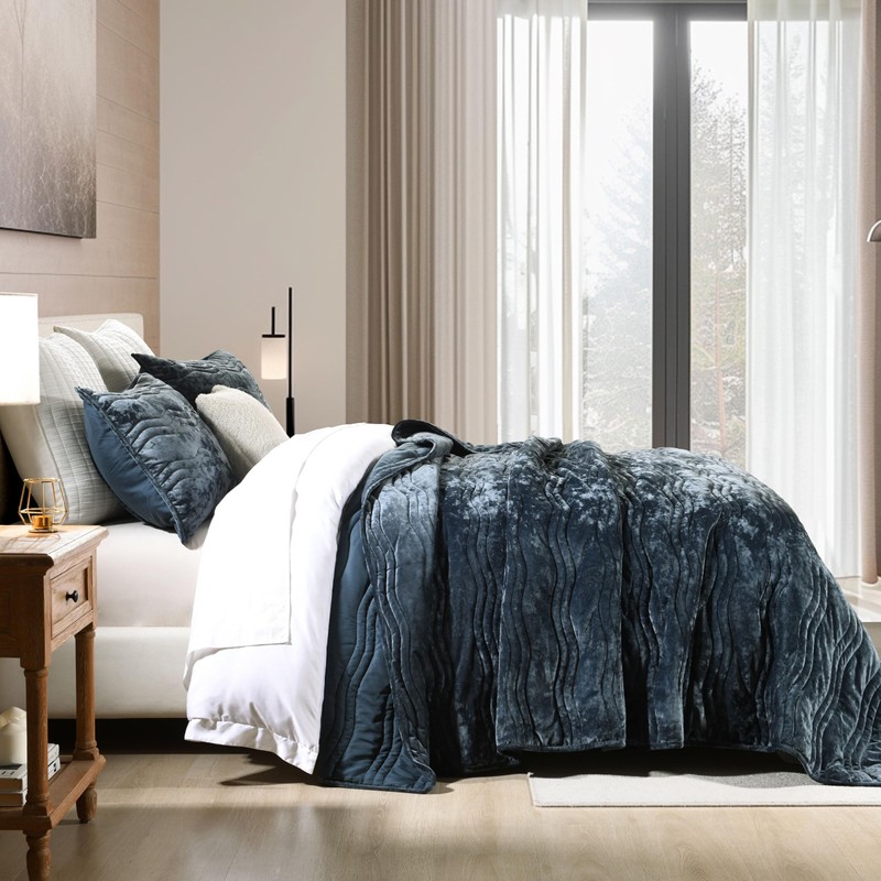AJOCCI Velvet King Size Comforter Set, Luxurious King Quilt, Blue Bedding Set, Soft Plush Bedspread, Lightweight for All Season,Stormy Blue