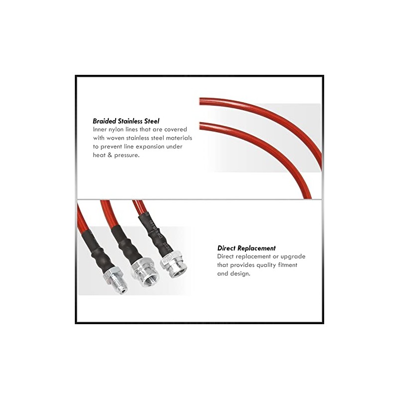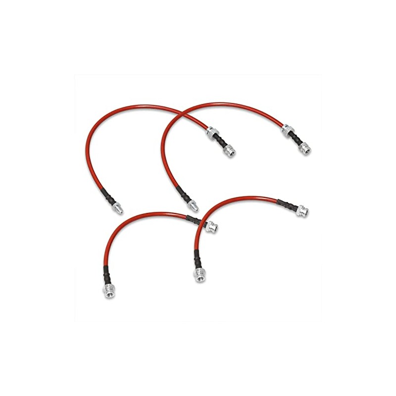 - Improves brake pedal feel, eliminates sponginess under heavy braking, and reduces brake line expansion compared to factory rubber hoses.
