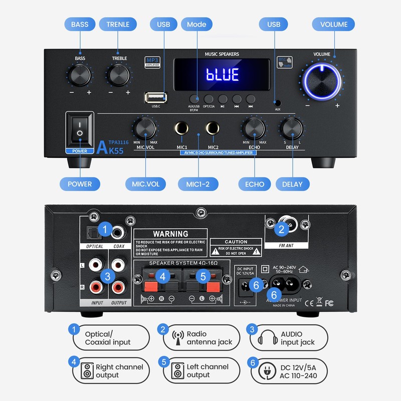 • 【Versatile 8-In/2-Mic System】: Supporting diverse audio sources, the home amplifier includes: Optical/Coaxial RCA inputs for audio components, two 1/4" microphone inputs, 3.5mm AUX port, USB playback, Bluetooth Optical technology, plus integrated FM radio tuner.