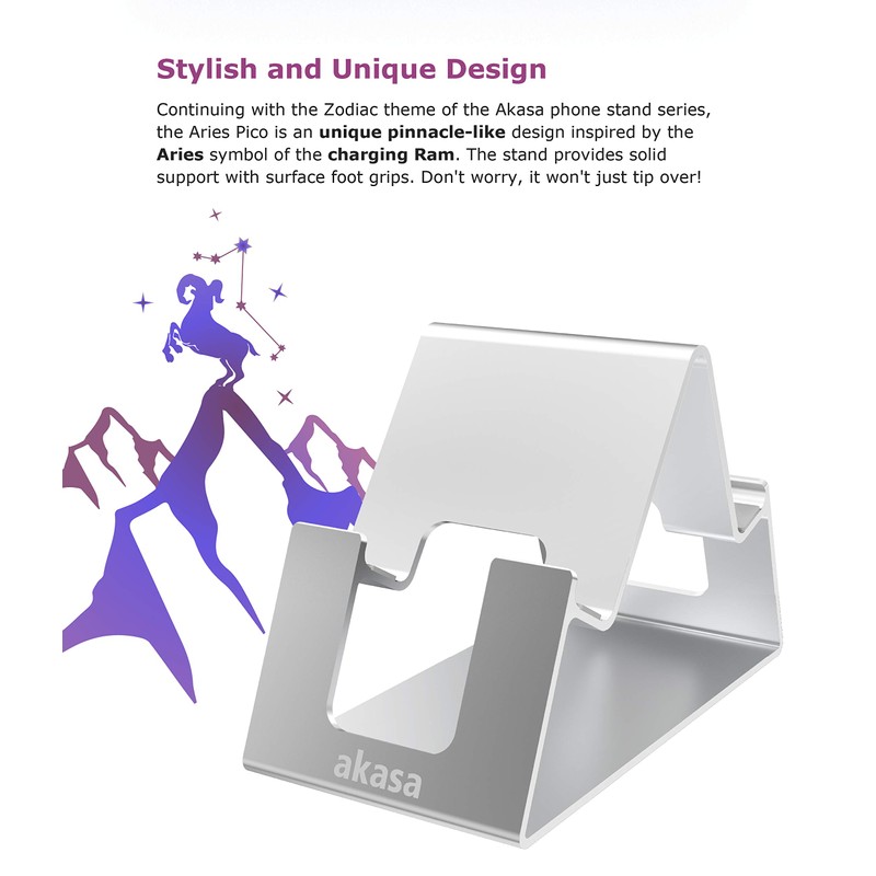 Continuing with the Zodiac theme of the Akasa phone stand series, the Aries Pico is a unique pinnacle-like design inspired by the Aries symbol of the charging Ram.