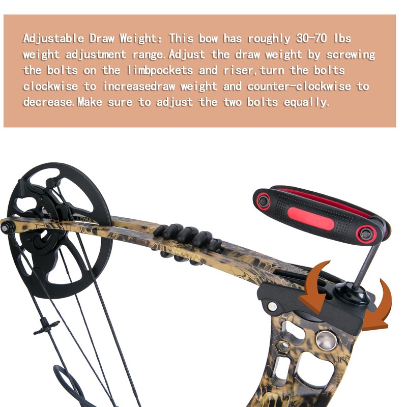 - READY-TO-SHOOT PACKAGE INCLUDES - 1 x Compound bow; 1 x 5 Pins bow sight; 1 x Brush arrow rest; 1 x Arrow quiver; 1 x Wrench set; 1 x Instructions; 1 x 60cm Target paper; 1 x D-Loop; 1 x Peep sight; 1 x Rubber stablizertring silencer set.