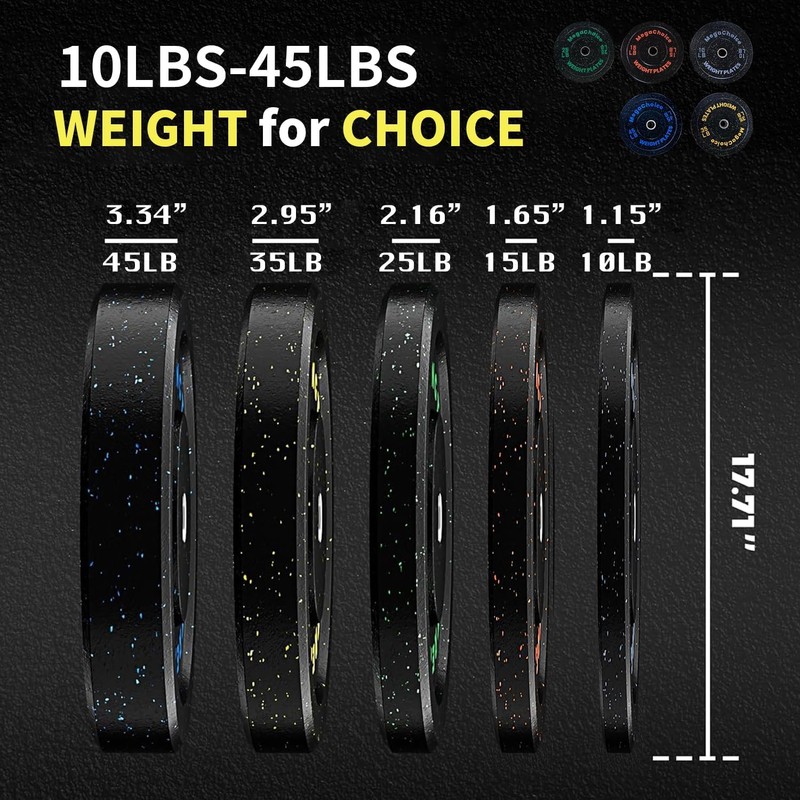 - 【Sturdy Construction】These bumper weights are of good quality and long service life, with reinforced steel rings with 50mm holes, these weights fit all standard 2-inch barbell sleeves. And the metal collar will not fall off. Each bumper weight has the same diameter, only different thickness, which allows for proper barbell balance and a more efficient weightlifting experience.