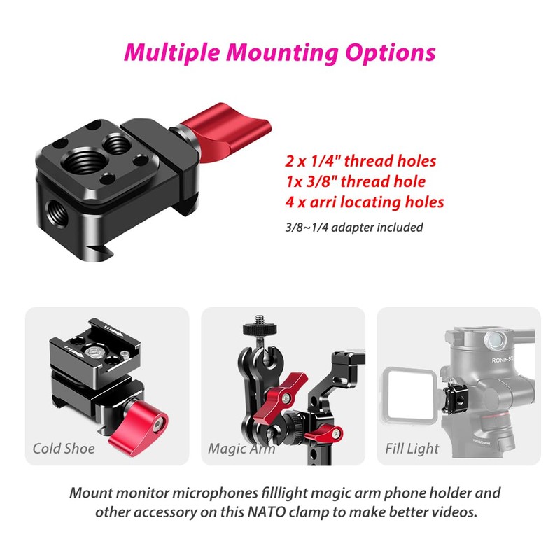 - 【Multiple Mounting Options】Equipped with 2 x 1/4", 1x 3/8" threads (3/8~1/4 adapter included) and arri locating holes, can mount monitor microphones filllight magic arm phone holder and other accessory on this NATO clamp to make better videos.