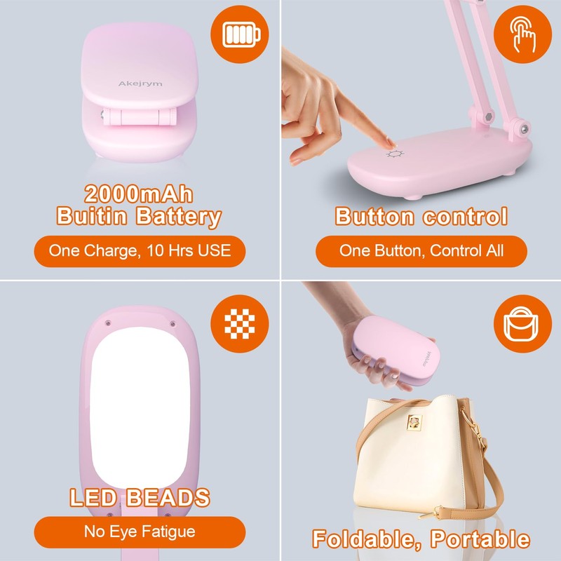 Akejrym LED Desk Lamp for Office Home & Battery Operated Lamp Rechargeable Lamp Foldable & Portable Light, [2-Fold Bracket] 3 Brightness Dimmable Small Desk Lamp Wireless Reading Lamp (Pink)