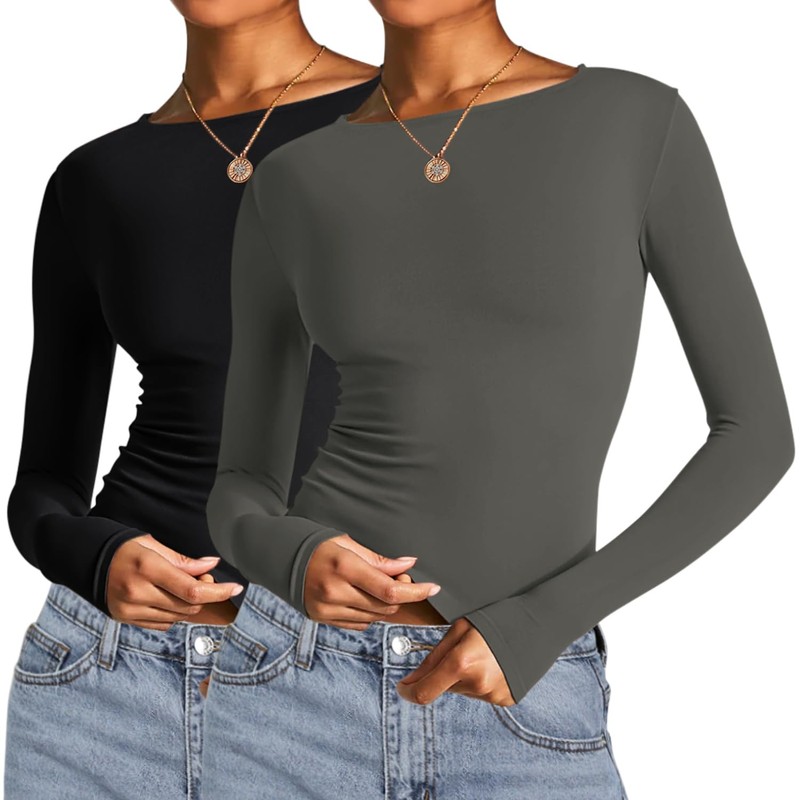 AKEWEI Womens 2 Pack Cropped Undershirt Long Sleeve Tight Fitted Basic Tops Trendy Fall 2025 Solid Tee (Black&Dark Grey, M)