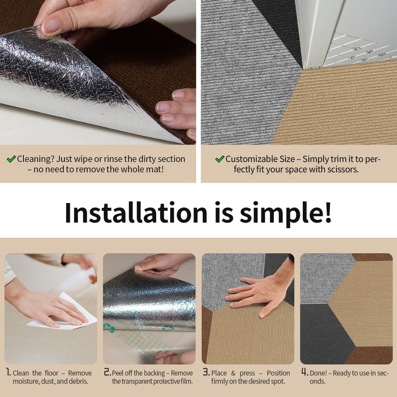 - EFFORTLESS PEEL & STICK INSTALLATION Experience the ultimate convenience of our peel and stick carpet tiles. The effortless carpet tiles peel and stick installation enables a quick DIY setup on any flat, dry surface. As true adhesive carpet, they allow for replaceable tiles for simple repairs and flexible layout adjustments, making them the ideal self adhesive carpet tiles for any room.