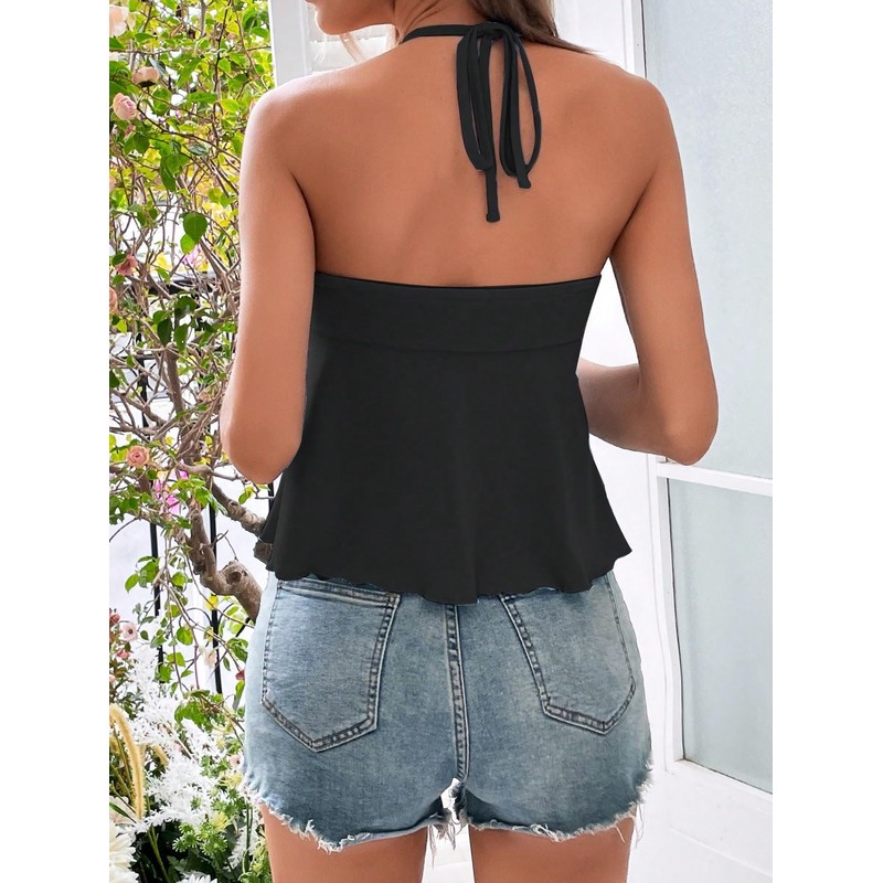- Cute Tops: Preppy sleeveless peplum spaghetti strap halter tops for women, clean fit ruffle trim flared hem ruched camisole, casual solid backless bow tie lace up cropped tank shirts for downtown girls vacation rave outfits, summer coquette clothes