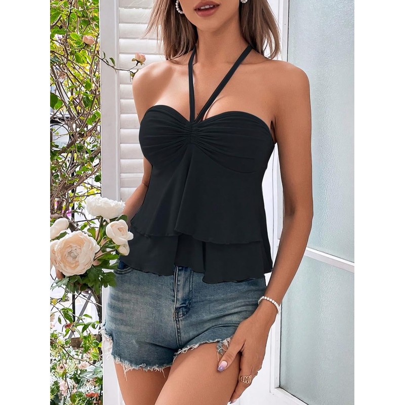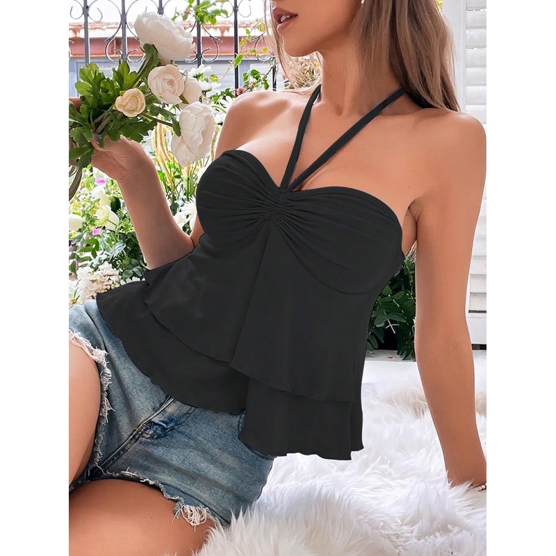 - Match: Vintage double tiered layer ruffle hem halter neck cami tank tops for women are girlcore 2000s E-girl fashion, pair well with mini skirts, denim jeans, handbag, boots for clean girl aesthetic y2k clothes, summer going out tea party outfits