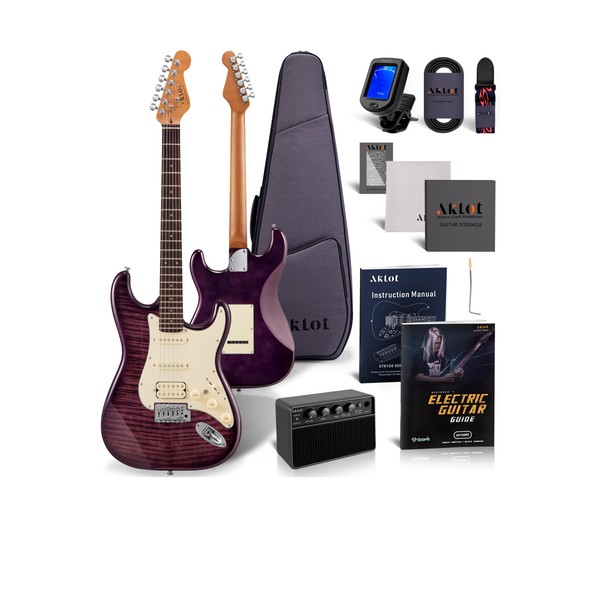 AKLOT Stryde Electric Guitar with Coil-Split: Roasted Maple Neck, Flame Maple Graphic Top, HSS Ceramic Pickups, Beginner Guitar Kit with 10W Amp, Gig Bag, Strap, Picks, Lesson Book, Violet Venom