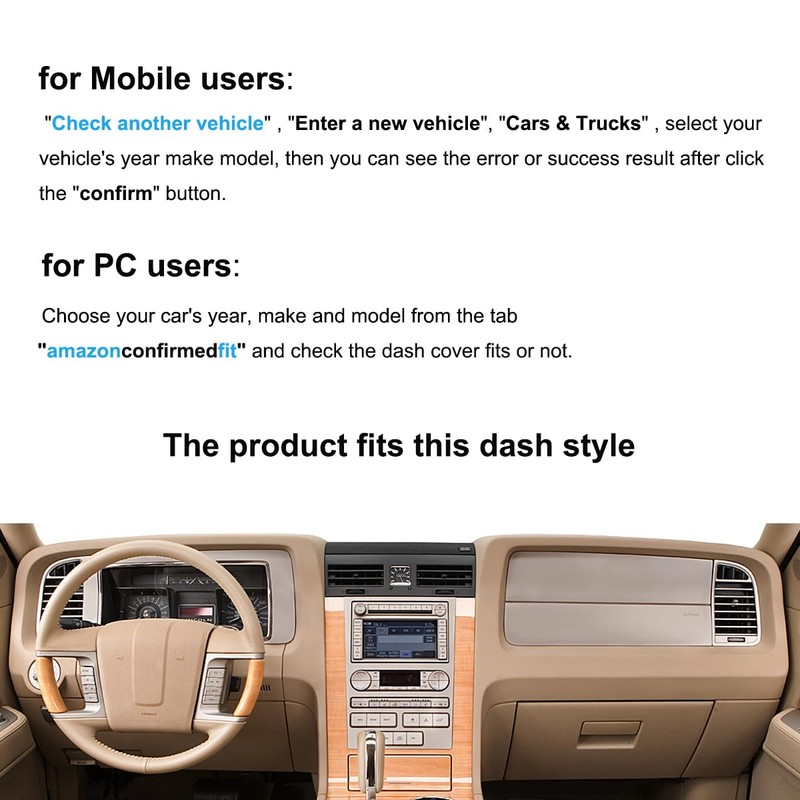 - Choose your car's year, make and model from the tab"amazonconfirmedfit" and check the dash cover fits or not;