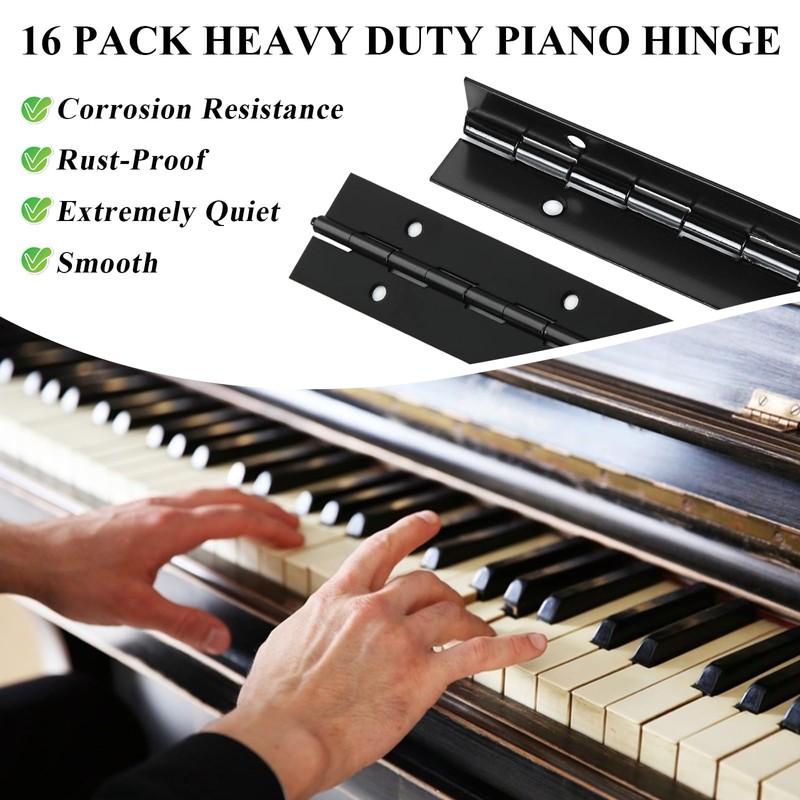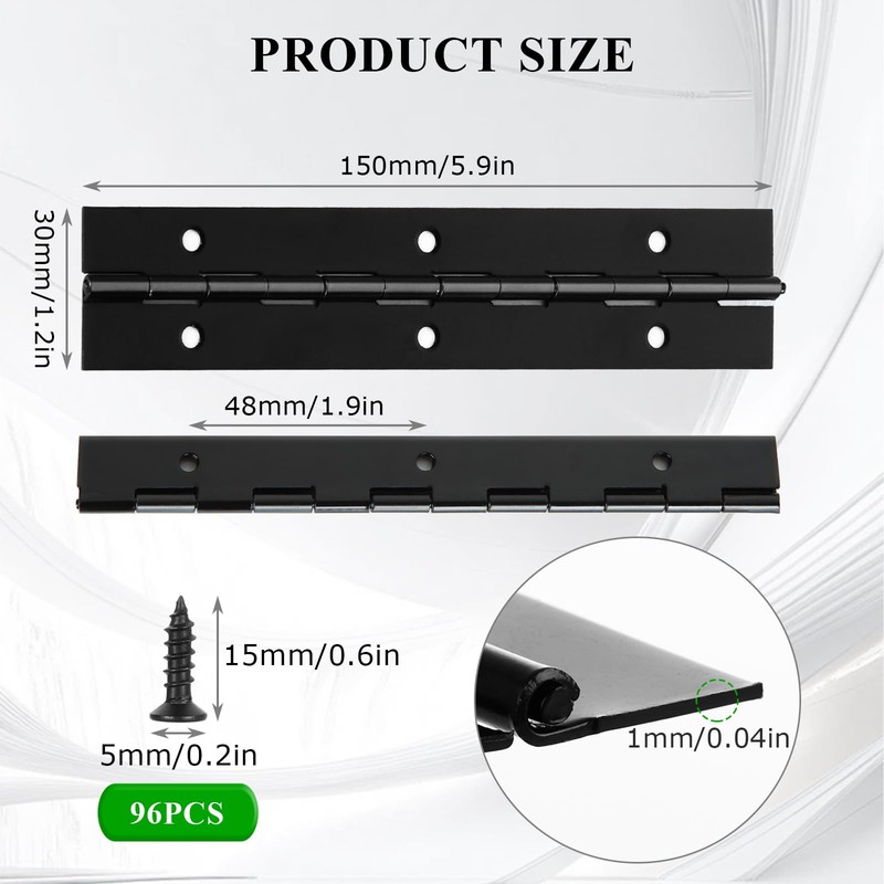 - 【Package & Sizes】 Package includes 16 pack Piano Hinges and 96pcs screws, making installation a breeze. Heavy Duty Piano Hinge are 6 inch in length, 1.2 inch in width, and 0.04 inch in thickness.
