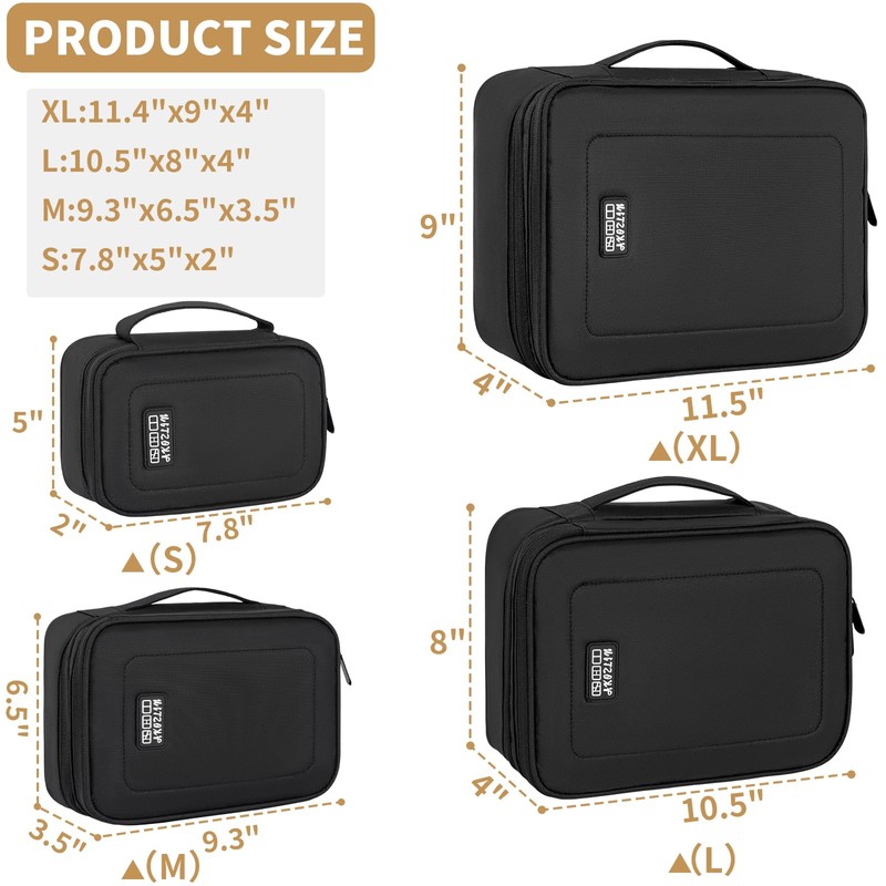 - Awesome Design: 4pcs electronic accessories travel organizer case can carry all you need, whether at home or for travel, it is greatly perfect. X-large : 11.4"× 9"× 4''; Large :10.5''× 8''× 4''; Medium : 9.3''× 6.5''× 3.5''; Small : 7.8''× 5''× 2