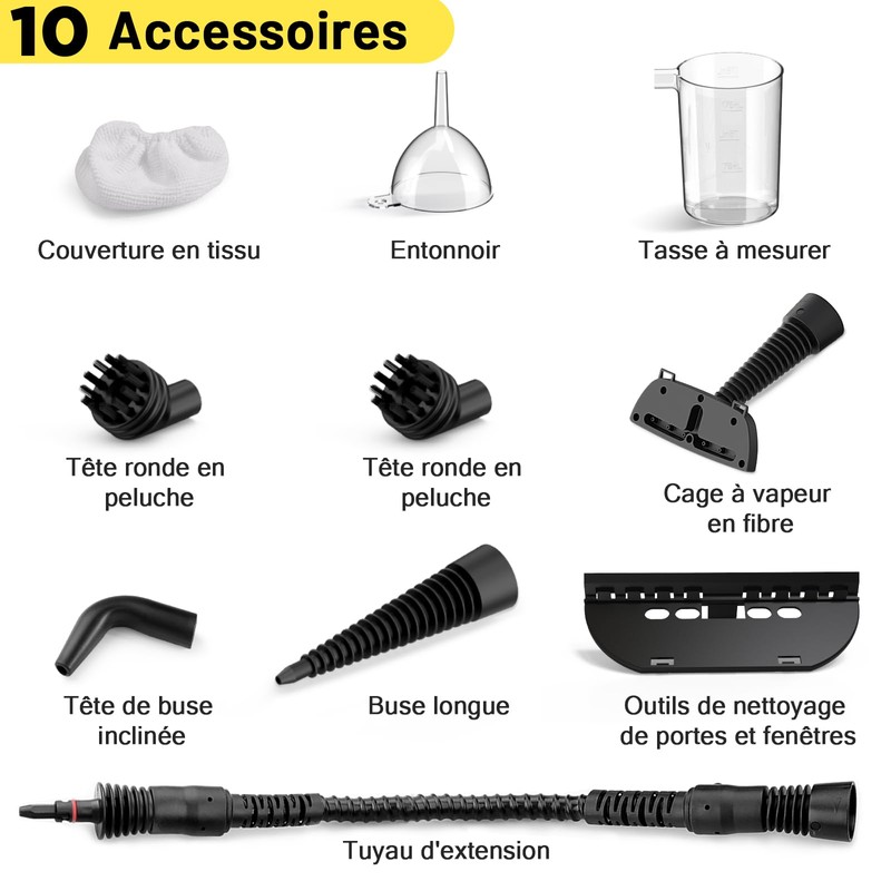 - 【10-piece Accessory Set】: AKPIAN steamers does an amazing job of cleaning and ironing. Plus 10-piece accessory kit such as: angled nozzle, bendable extension, nozzle with brush, fabric steamer tool, rubber wiper for window/door, and many other extras. It’s all-purpose and can go and clean out any hard to reach gaps, corners, angles, and also various surfaces/materials: kitchen sink, countertop, toilet, BBQ grill, shower curtains, floor, kids’ toy, pet mattress, sofa, car, and clothing.