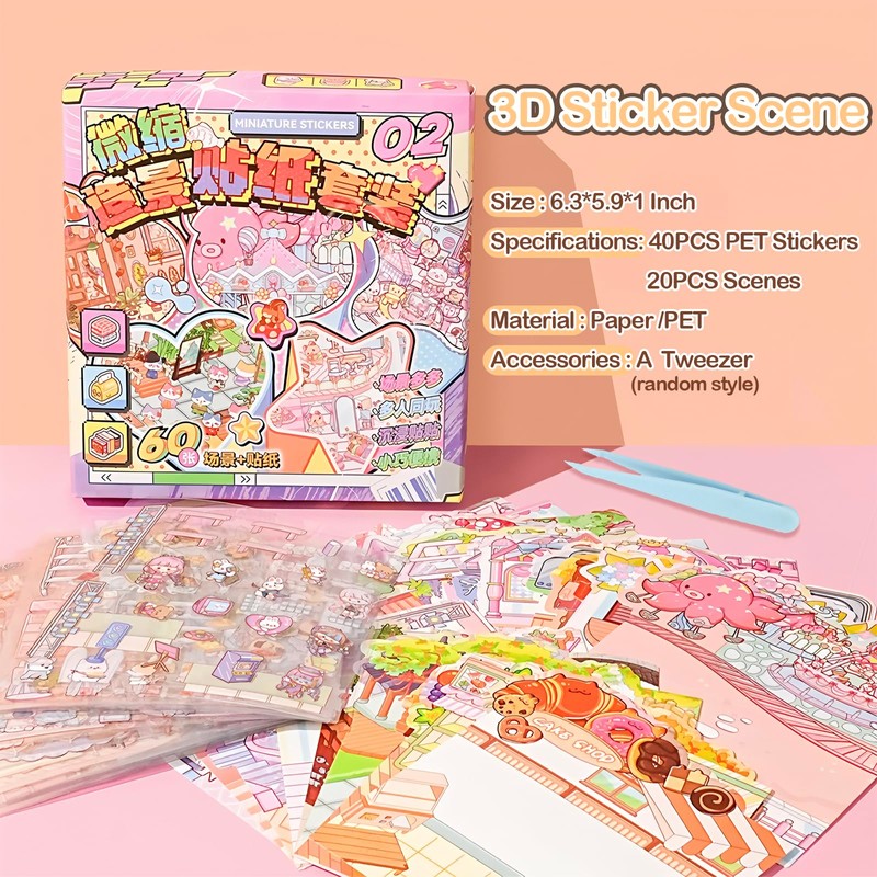 - Contents of the 3D Stickers Package - This sticker set includes 40 high-quality PET stickers, 20 background boards, a design reference chart featuring all the scenes, and a tweezer in a random color. All materials are neatly packaged in a small box for easy organization and use