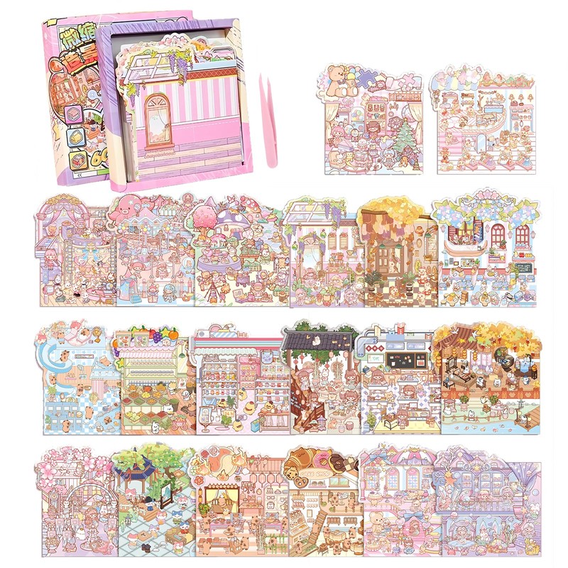 AKPLIT 3D Sticker Scene, 20 Sets DIY 3D House Stickers with Box-Packed, Sticker Therapy Cute Cartoon Scenes for Adults Kids Relief Stress Pass The Time,Make Your Own Mini Room Scenes